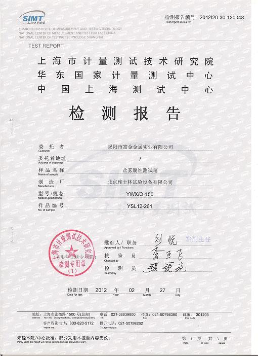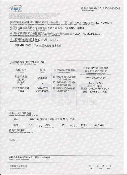 鹽霧腐蝕試驗箱檢測報告-上海計量院-富金實業