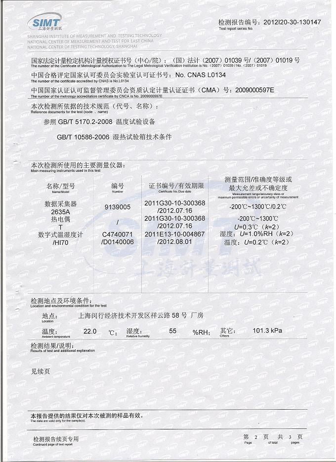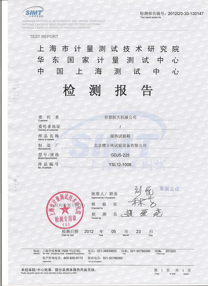>>高低溫交變濕熱試驗(yàn)箱檢測(cè)報(bào)告-上海計(jì)量院-首都航天