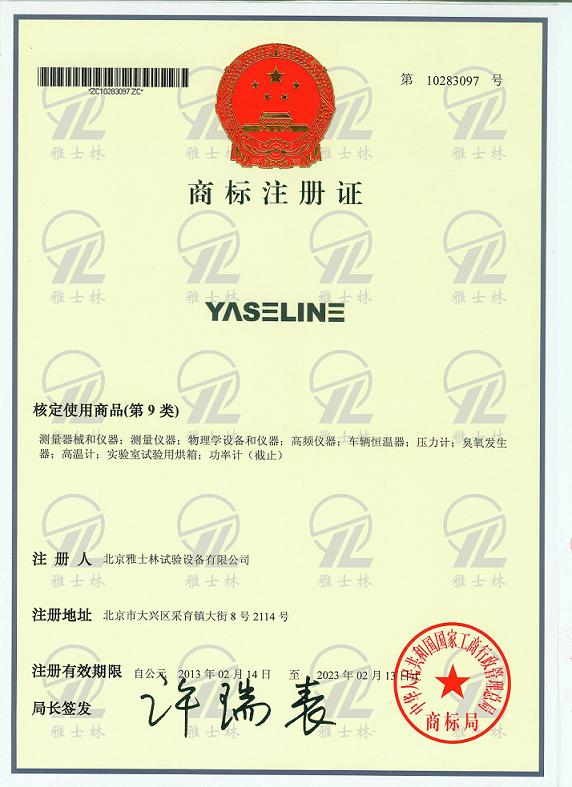 >>高端環(huán)試品牌YASELINE注冊商標(biāo)獲得通過